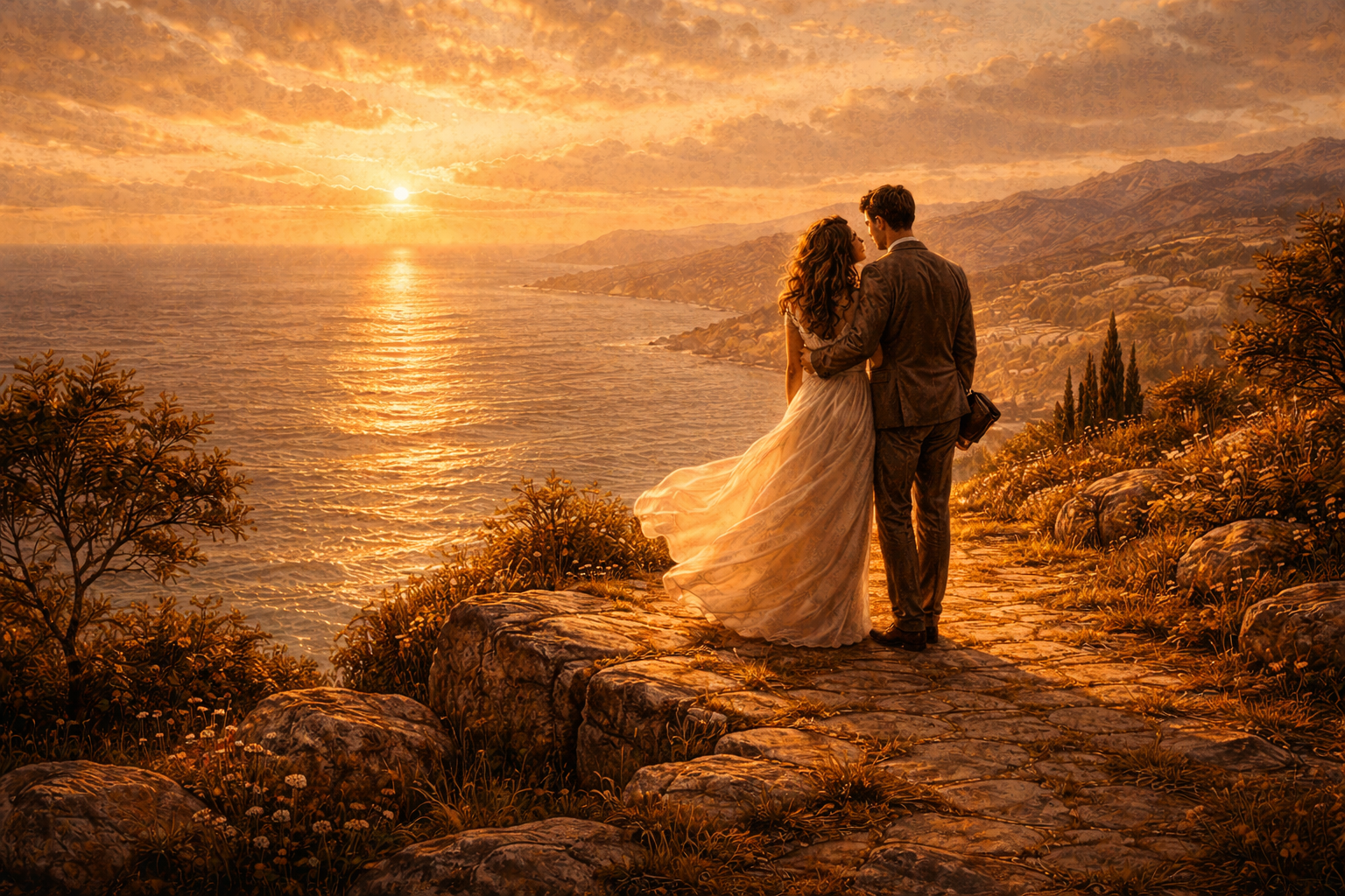 The Vows of Revolt: The couple faces each other. Each speaks: "I cannot promise the universe will be kind. I cannot promise I will always be wise. But I can promise this: I will push the rock beside you. I will choose joy with you. And when the boulder rolls back down — because it will — I will walk back down the hill with you, smiling."